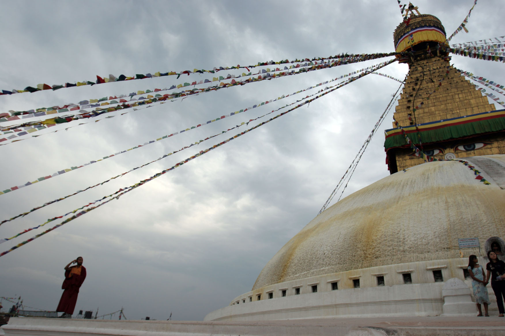 Buddhist monk helping usher people off the stupa for closing.