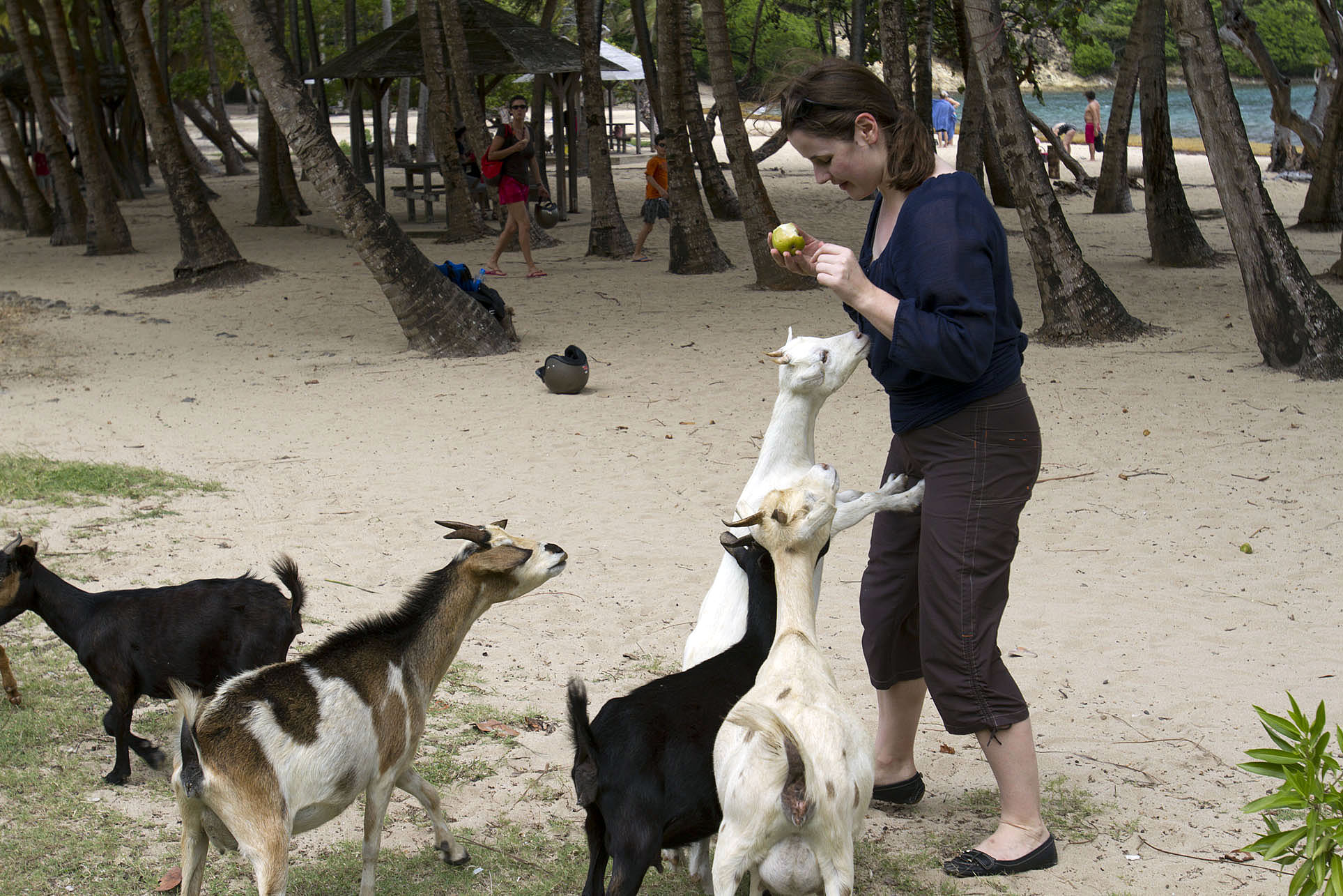 Feeding the goat inhabitants of Pont Pierre beach, Les Saintes