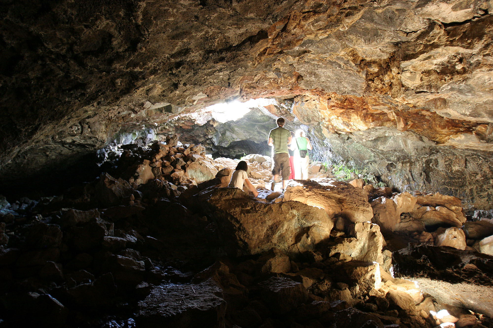 Ana Te Pahu, a large cave with banana trees growing through the hole in the roof