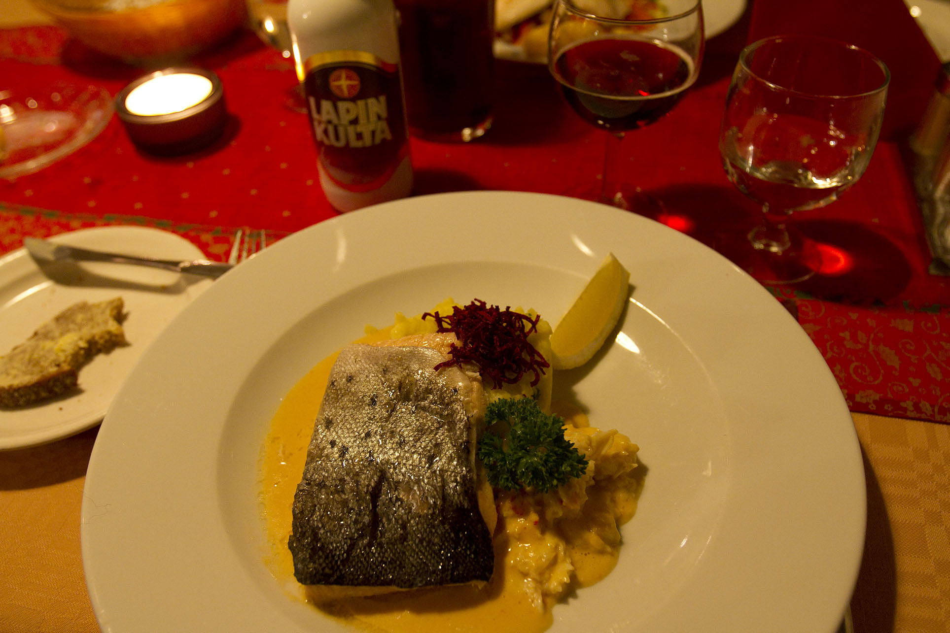 Lake Inari trout, North Sea crab, and mashed potatoes with beet, and Lapin Kulta, the local beer.