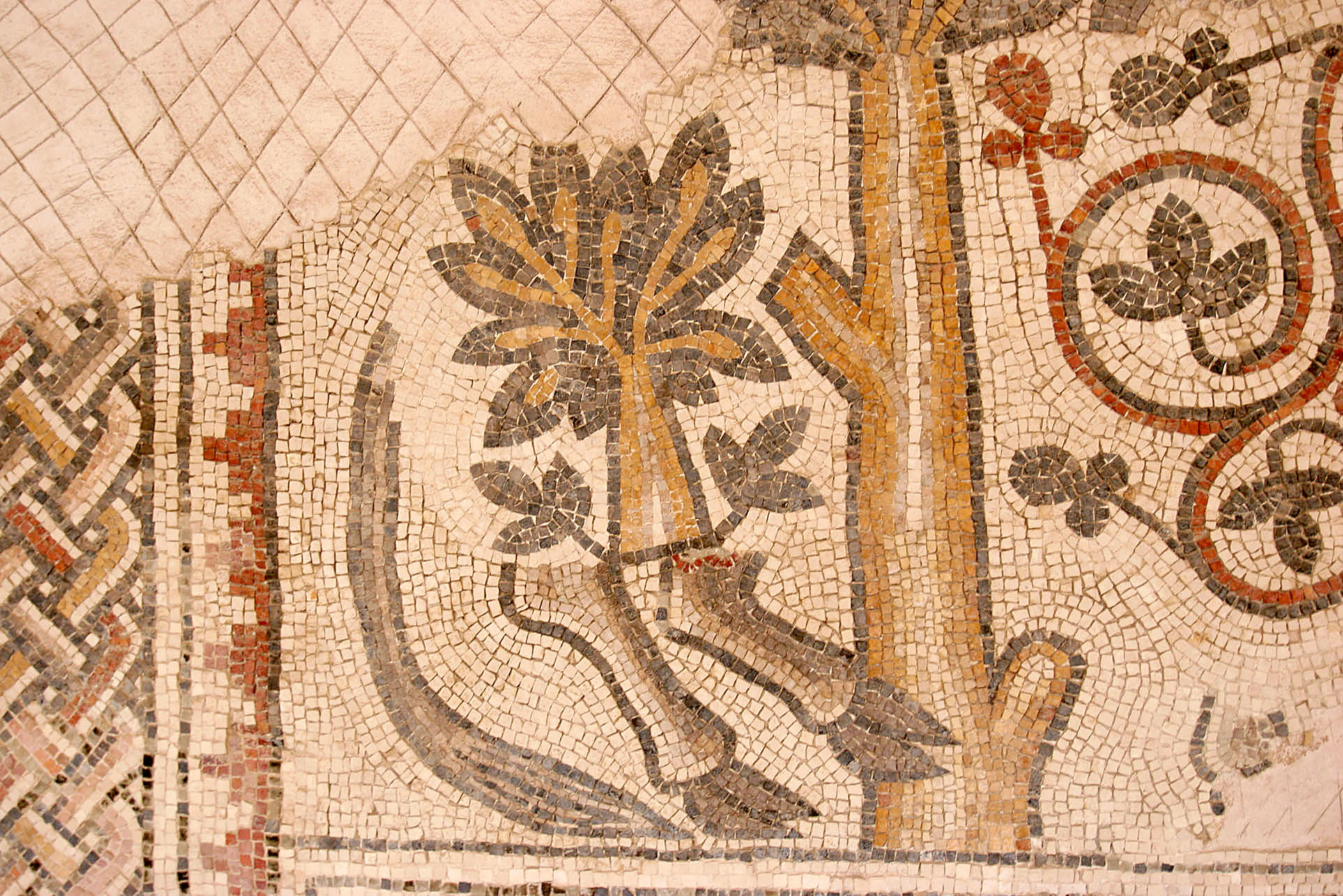 Old mosaic in Madaba. For some reason, the restoration involved grafting a tree onto a donkey's legs.