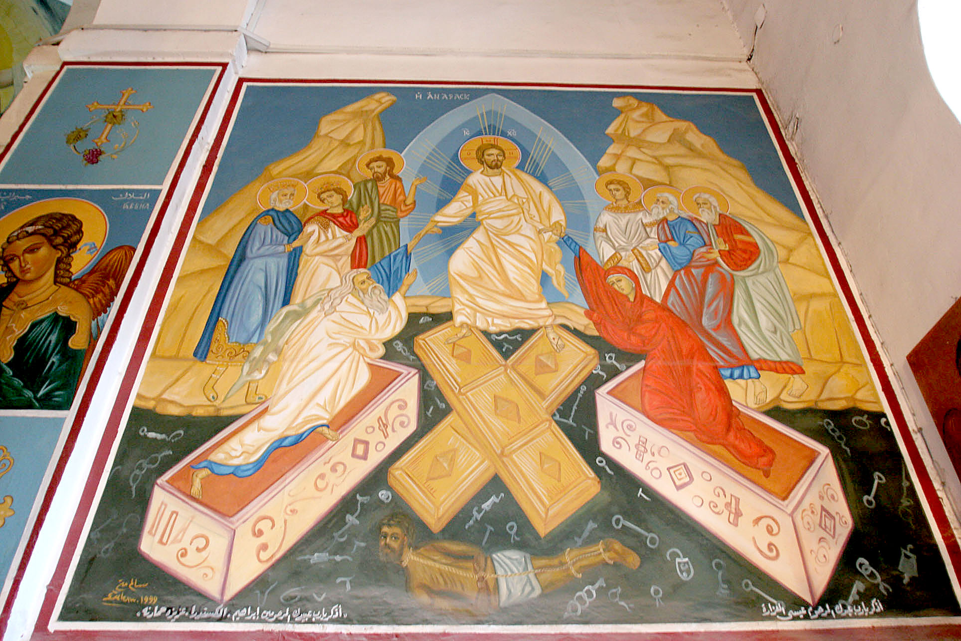 Jesus Christ surfing on some coffin lids while some bound guy drowns beneath him?