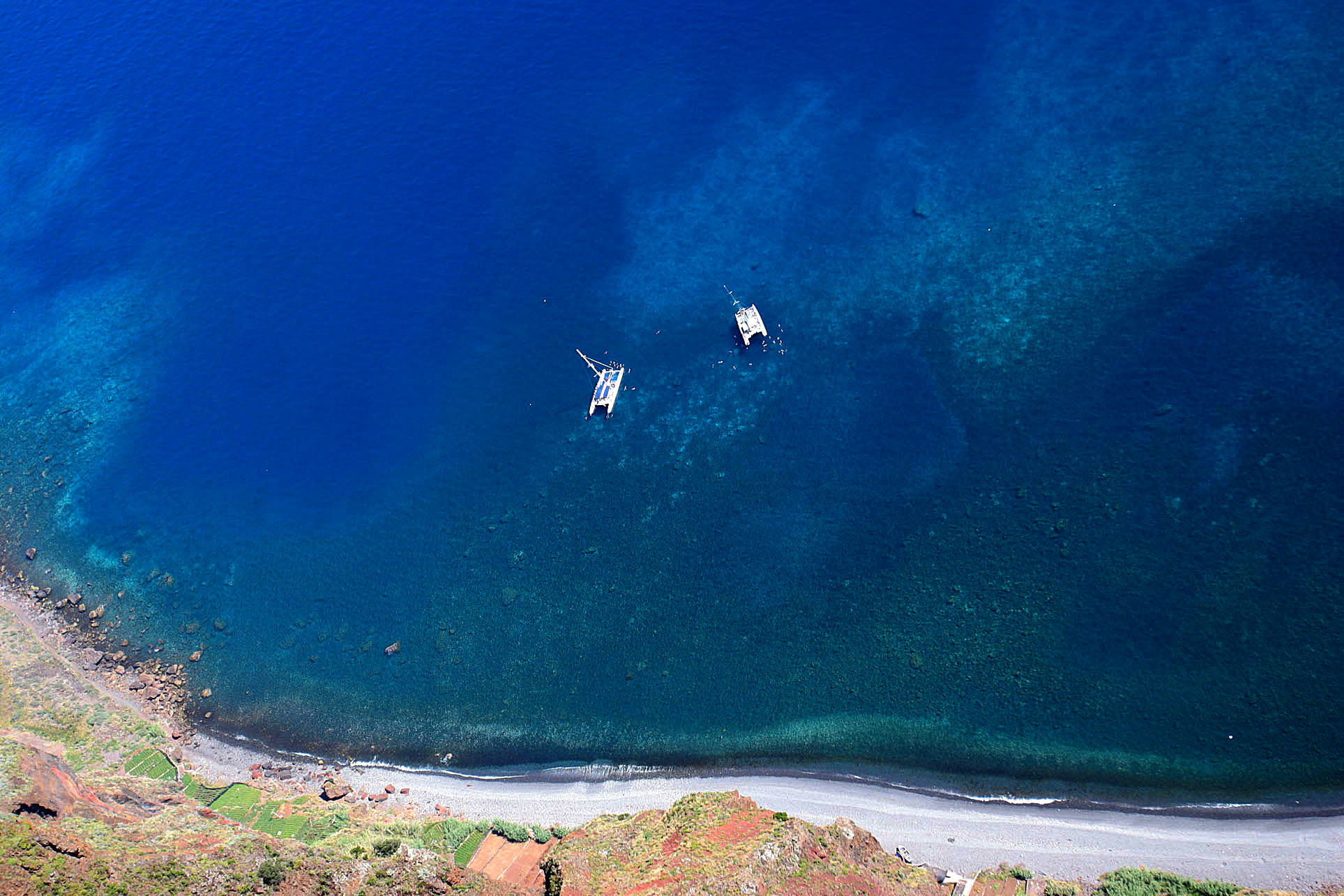 Tourist whale watching boats stopping for a dip south of Cabo Girão, 1930 ft high