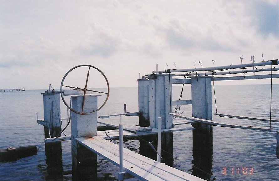 I've moderately poked a bit of fun at old Ray, but he was rather crafty. When his dock was blown away in one of the more recent hurricanes (Floyd? Lloyd? Whatever), he set about rebuilding it himself, not to be bothered with the Village and its slow permitting or the Army Corps of Engineers approving it for environmental friendliness. Here you can see Ray installed his very own boat hoist, to prevent any watercraft from growing unsightly grass on its hull from extended stays in the water.