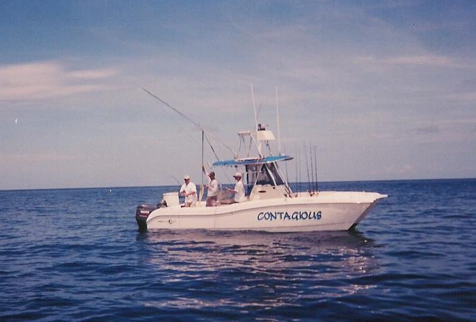 After a good first day fishing, we decided to give reef fishing another try. The day before it was hellishly rough getting offshore, and it was supposed to be the same the next day. For this reason, we wanted to stay in calmer waters. We've had about 0% success on the reef, and some practice was in order. On the way out, there was a large thunderstorm offshore, from which a waterspout spiraled down. Always a neat thing to see, so we were off to a good start. Unfortunately, once we got anchored and put some chum in the water, we realized there was absolutely no current. In my boredom, I was looking at the clouds, trying to avoid watching bits of fish float straight down, instead of forming a nice slick back behind us. One cloud was peculiar, in that it was brilliantly rainbow-colored, like an oil bubble floating in the sky. Some days, these two things would suffice for the "cool things of the day." Not so, today.