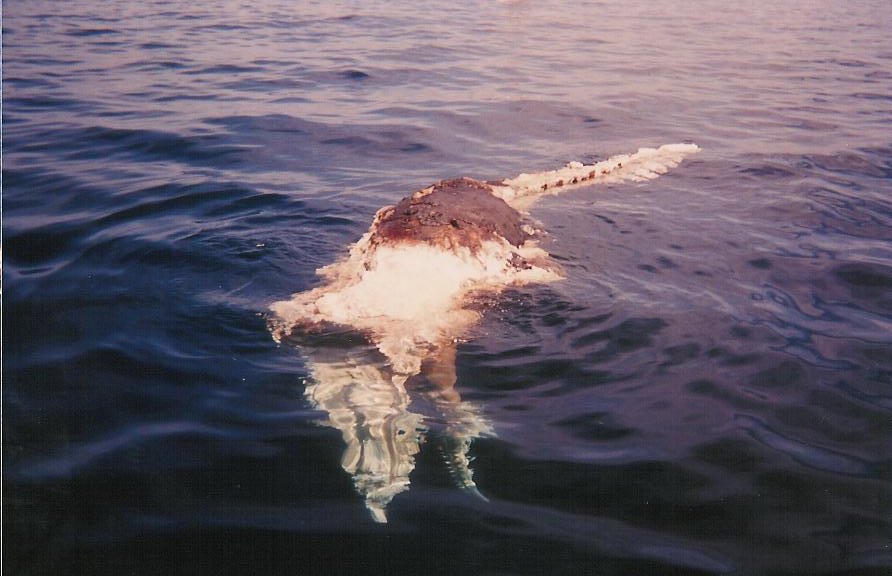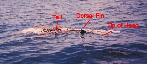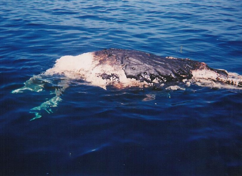 A comparison for size. The boat in the background is 27' long, showing the carcass is easily 20', even missing a good portion of its tail. Still, this was a baby, as sperm whales get 60'+.