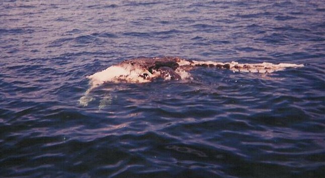 An unfortunate consequence of the crappy camera used is that you can't see the enormous column of blood pouring out of this body. Even as just the remains of its back, there must have been a thick cloud of blood extending a couple hundred feet down into the sea. The oil and fat from the body helped create a slick on the water that extended for easily half a mile in all directions. There were even droplets of oil and blubber floating on the water. Yum.