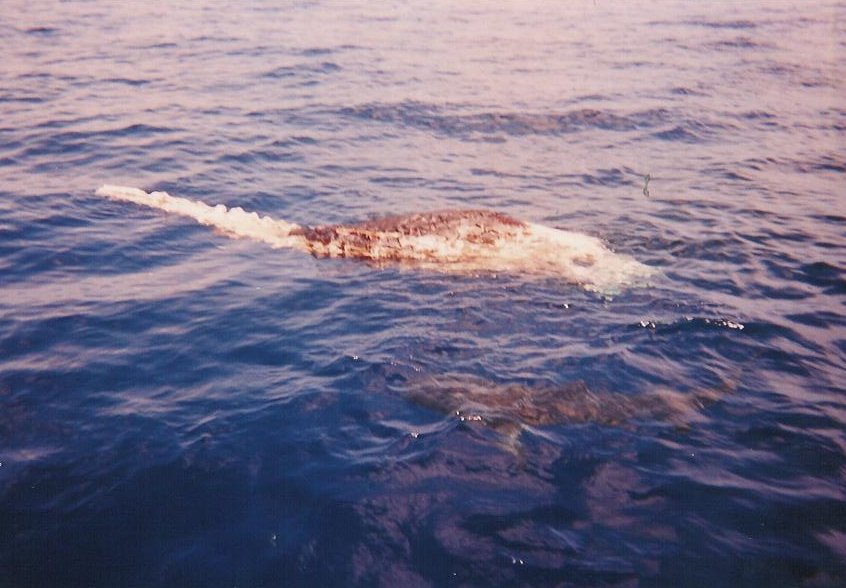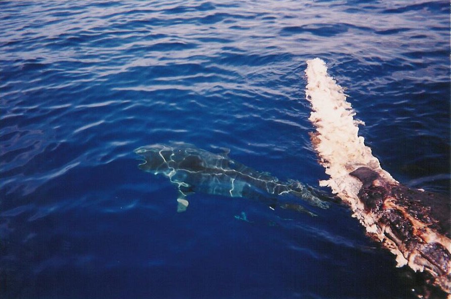 This wasn't just any tiger shark, however. This monster was around 16' long, and must have weighed at least 1000lbs; it was nearly as large as the whale carcass! Its head was at least 2 feet wide. It's one thing to see a tiger shark, as they are fairly rare these days. To see one of "JAWS" proportions is awe-inspiring. We finished pulling a second tooth, and then untied the carcass. As we drifted a little bit away, the shark made another pass. As I watched its travel, something moved in the corner of my eye near the whale. It was a SECOND tiger shark! This one was a 'mere' 13' long, weighing around 400lbs.